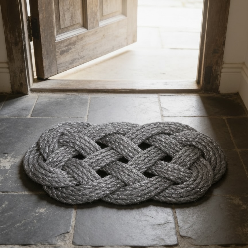 A handmade rope mat formed using a traditional sailor’s knot — substantial underfoot, quietly decorative, and made to last.
